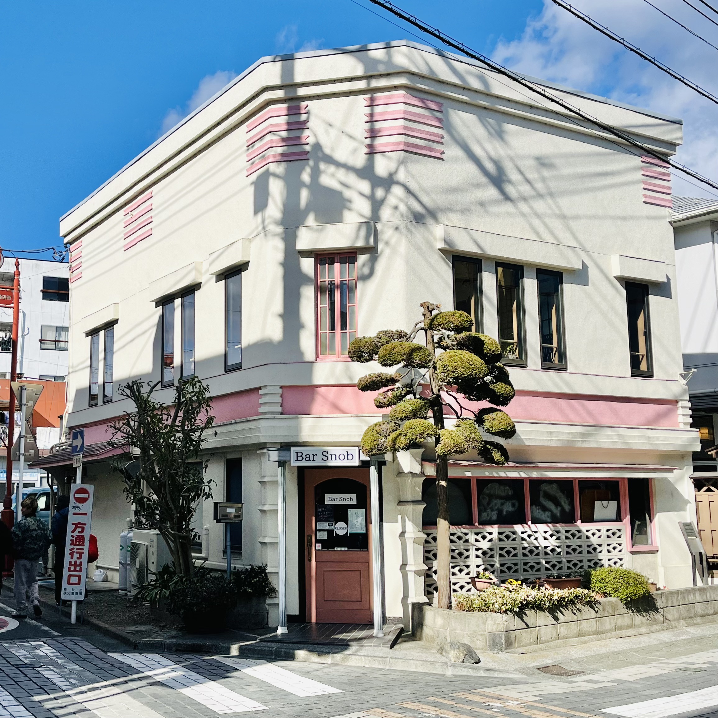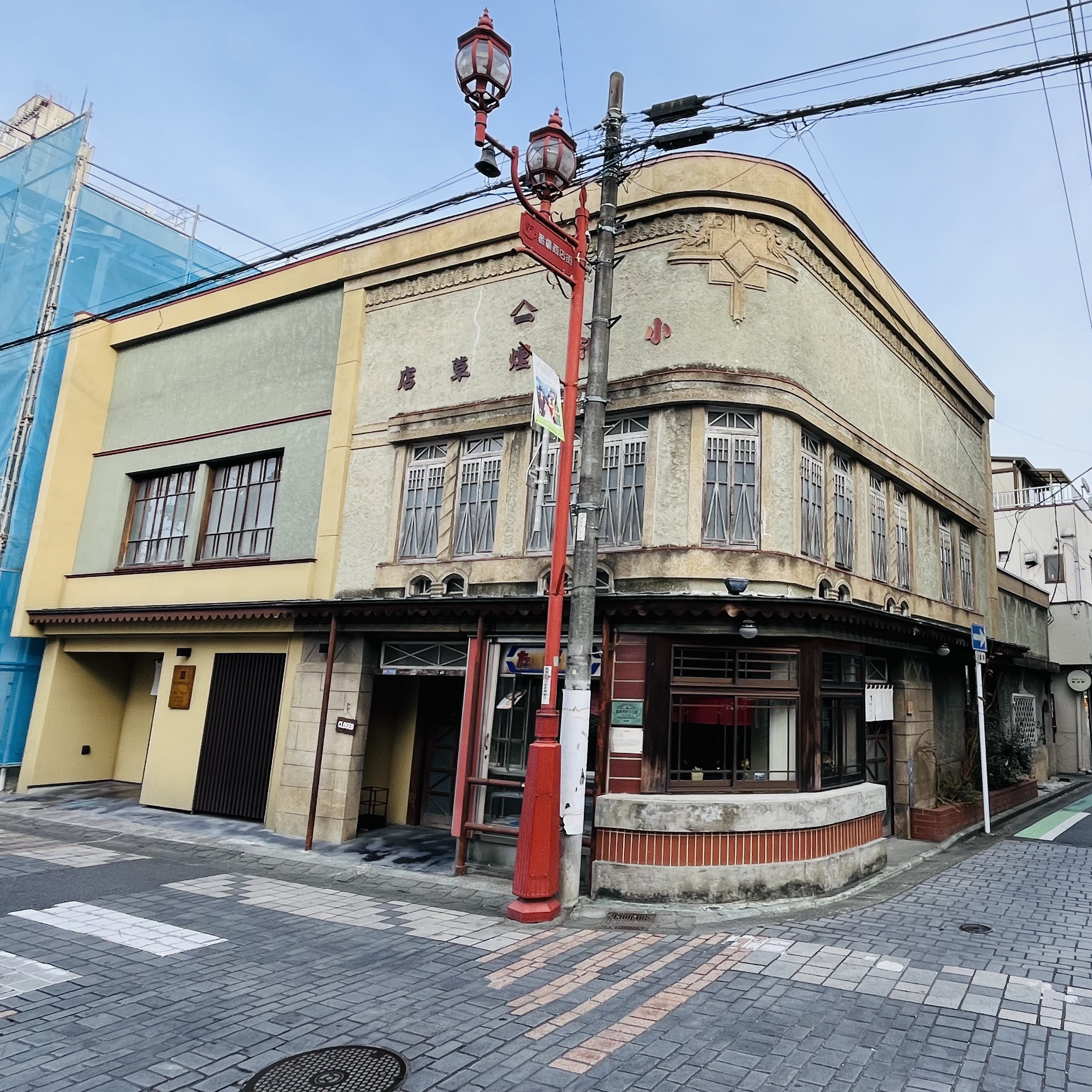 秩父鉄道「御花畑」駅から「番場通り」を秩父神社へ向かうとレトロ建築の交差点に出会う。大正から昭和初期に建てられた看板建築群で、左からカフェ(当時はたばこ屋)、洋食屋、旅館(登録有形文化財)、肉屋が並ぶ。