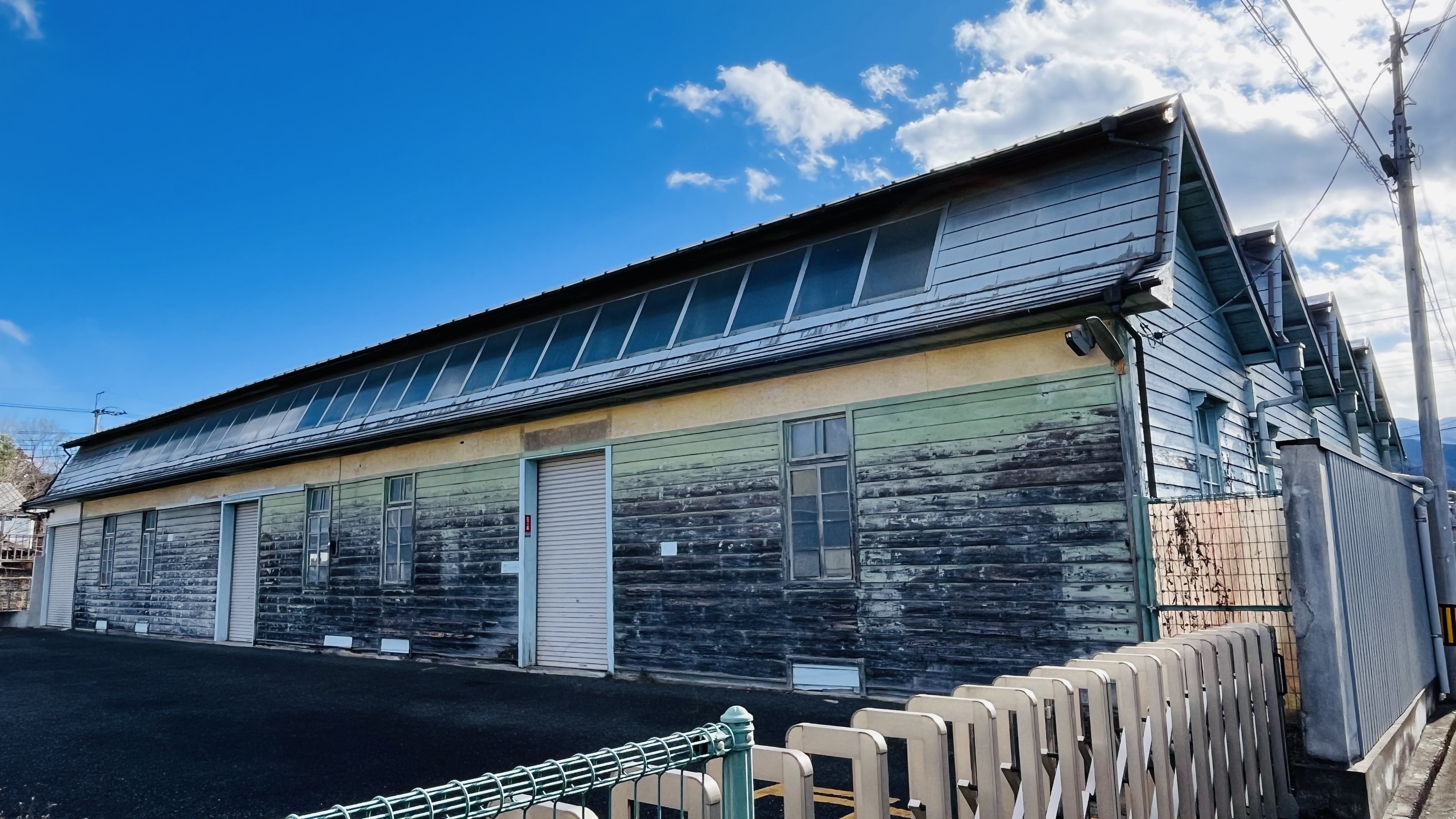 連続するノコギリ屋根が残るかつての織物工場の遺構。歴史的建造物の調査・保存・再生家の渡邉義孝先生から即興図解で建物のディテールを解説いただいた。