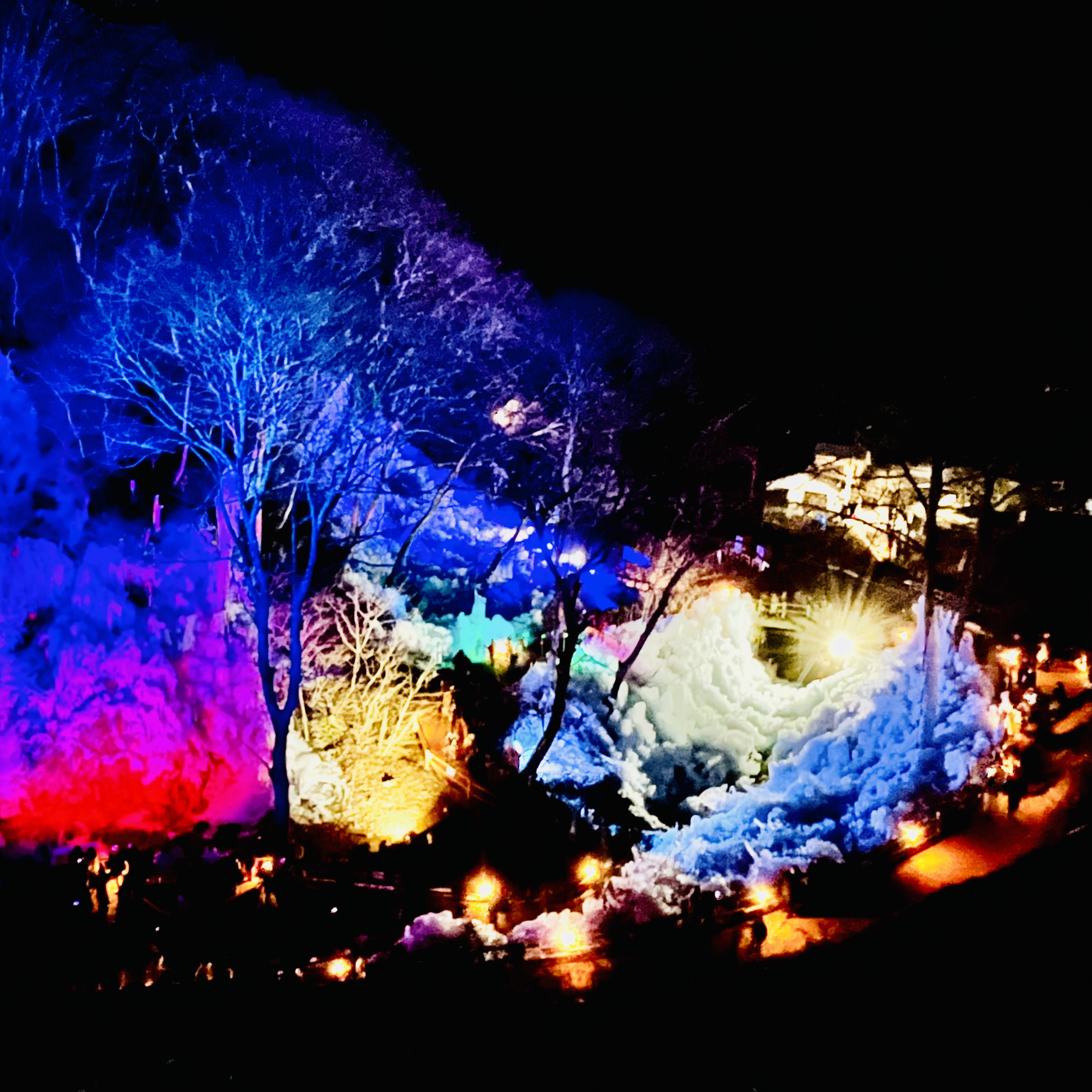 最後にちちぶ三大氷柱めぐりのひとつ「あしがくぼの氷柱」。高さ30m、幅200mに渡り幻想的なライトアップでこの旅を終える。